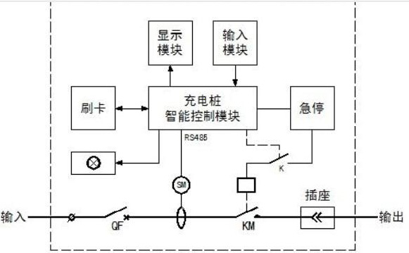 交流充電樁電氣系統(tǒng)如圖 2所示,主回路由輸入保護(hù)斷路器、交流智能電能表、交流控制接觸器和充電接口連接器組成;二次回路由控制繼電器、急停按鈕、運(yùn)行狀態(tài)指示燈、充電樁智能控制器和人機(jī)交互設(shè)備(顯示、輸入、刷卡)組成。